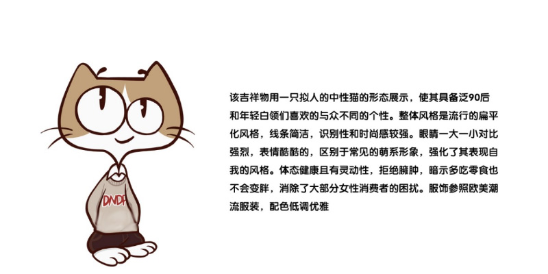 該吉祥物用一只擬人的中性貓的形態(tài)展示,使其具備泛90后 和年輕白領(lǐng)們喜歡的與眾不同的個(gè)性。整體風(fēng)格是流行的扁平 化風(fēng)格,線條簡(jiǎn)潔,識(shí)別性和時(shí)尚感較強(qiáng)。眼睛一大一小對(duì)比 強(qiáng)烈,表情酷酷的,區(qū)別于常見的萌系形象,強(qiáng)化了其表現(xiàn)自 我的風(fēng)格。體態(tài)健康且有靈動(dòng)性,拒絕臃腫,暗示多吃零食也 不會(huì)變胖,消除了大部分女性消費(fèi)者的困擾。服飾參照歐美潮 流服裝,配色低調(diào)優(yōu)雅.